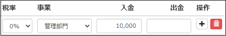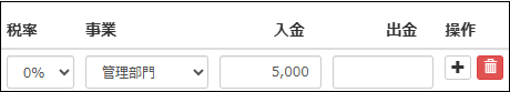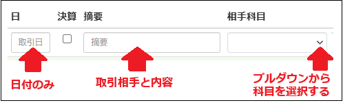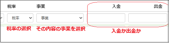 「日」「摘要」「相手科目」「税率」「入金か出金の額」をいれていきます