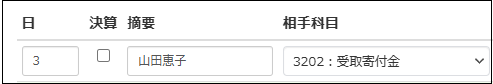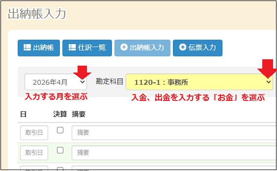 入力画面が出たらいまから「入力する月」と「入出金する科目」をプルダウンから最初に選択