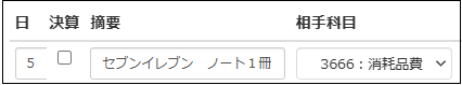 日付:5日、摘要:セブンイレブン ノート1冊、科目:消耗品費(税率は自動)