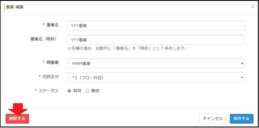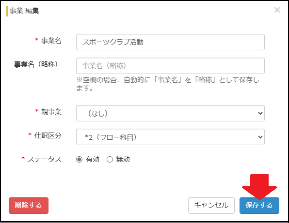 ※注意 ここでは「事業」の設定をおこないます。「管理部門」は、あらかじめ組み込まれているのでここで作成する必要はありません。間違って「管理部門」を作らないようにしましょう