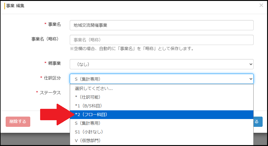 KKK事業は「集計専用」になっているので、プルダウンから「フロー科目」に変更