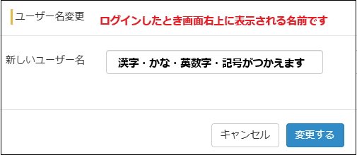 ログインしたときに、右上に法人名の横に表示されるのがユーザー名です