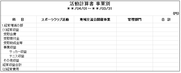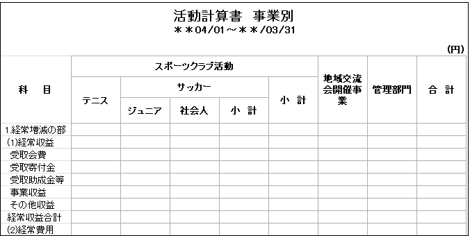 (事例2)事業は大きくわけると「スポーツクラブ活動」と「地域交流開催事業」の2つで、さらにもっと細かく事業を分けたい