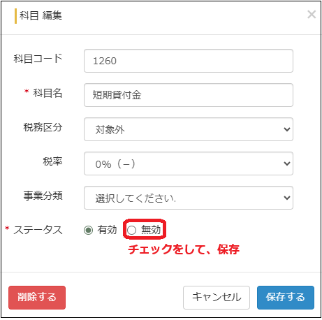 短期貸付金、前払費用 は、それぞれ「編集」を押して小窓を開き「無効」にする