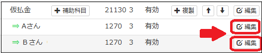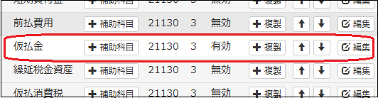 仮払金に、補助科目が2つあるのでそれを削除します。削除する科目の「編集」から小窓をだして削除します