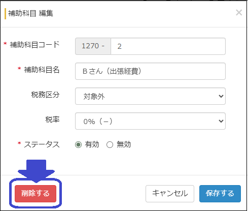 注意)ただし、過去にデータ入力をしてその「補助科目」を使っている場合は削除できませんので、新しく科目をつくってください