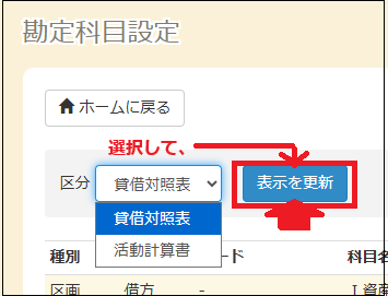 勘定科目設定で「貸借対照表の科目」か「活動計算書の科目」かを選択し「表示を更新」します