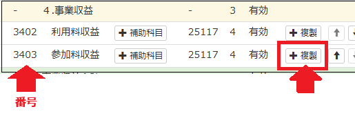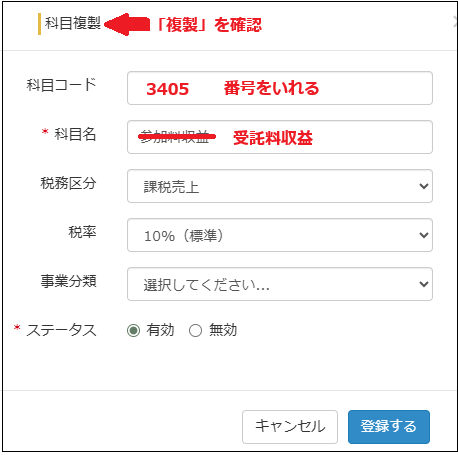 「参加料収益」の「複製」をクリックして小窓をひらき名前を変えて登録します