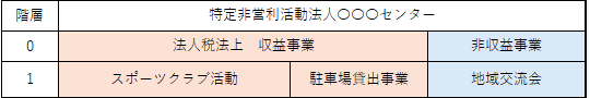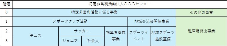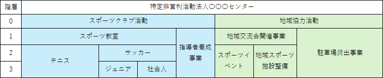(例)スポーツクラブ活動が一番上の階層で、その下にスポーツ教室と指導者養成事業があります